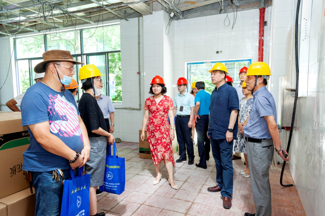 在食堂一楼工程施工现场,朱晓青副书记、副校长听取了工程施工进程,叮嘱他们要把安全施工放在首位,并且要切实做好防暑降温工作。