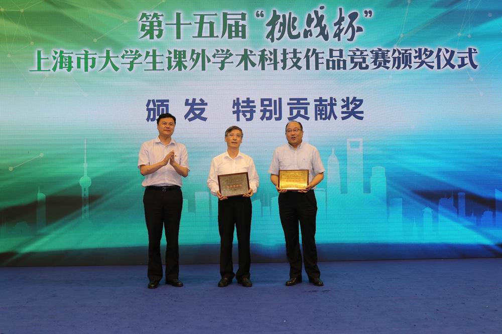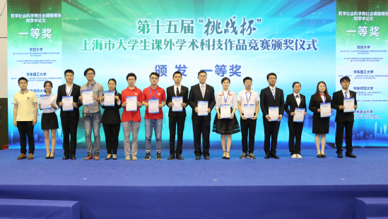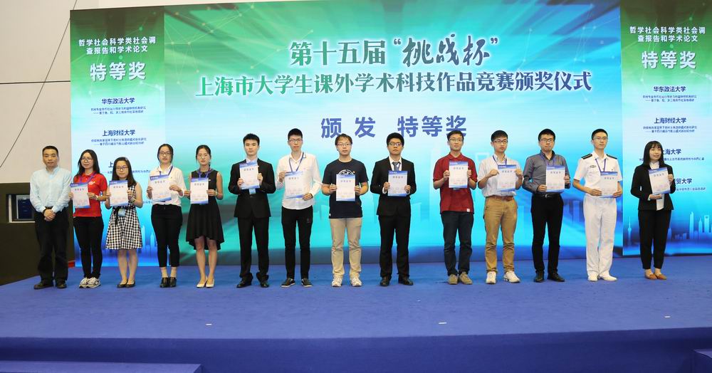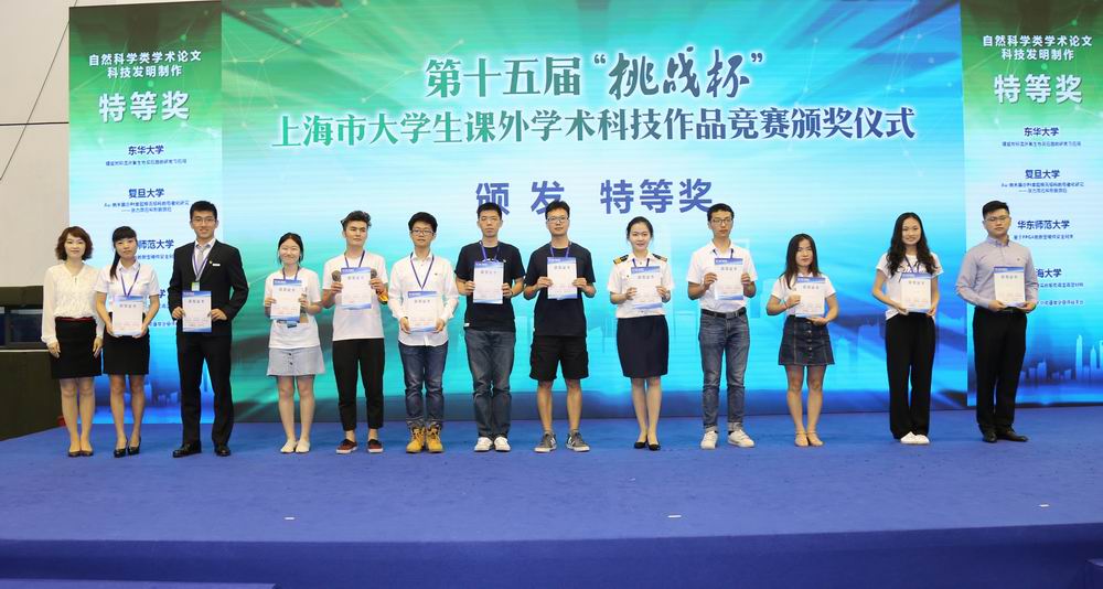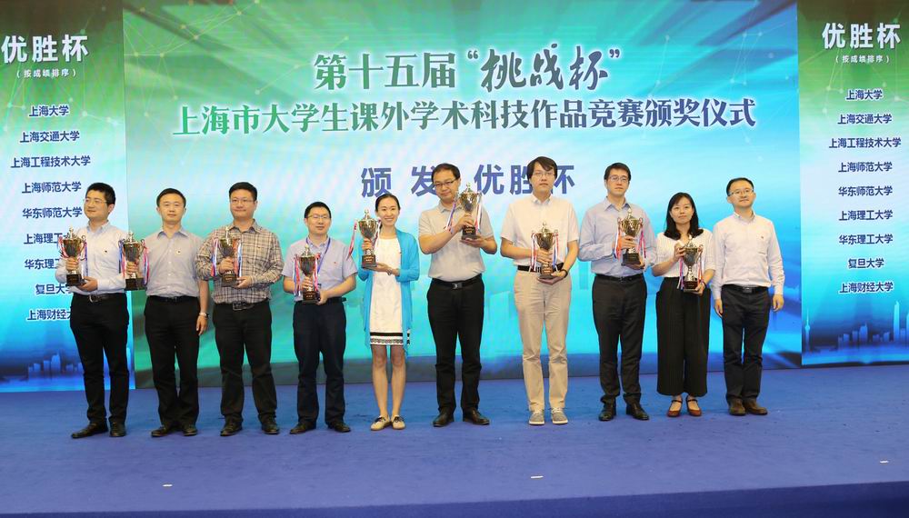 6月9日、10日第十五届“挑战杯”上海市大学生课外学术科技作品竞赛决赛暨颁奖仪式在我校体育馆隆重举行。经过激烈的比拼,我校取得“挑战杯”上海市赛突破性成绩,获得三个特等奖、三个一等奖、二个二等奖、二个三等奖的历史性突破成绩,不仅学校总分仅次于同济大学、上海大学、上海交通大学,位列全市第四名,更是首捧“挑战杯”上海市大学生课外学术科技作品竞赛“优胜杯”。