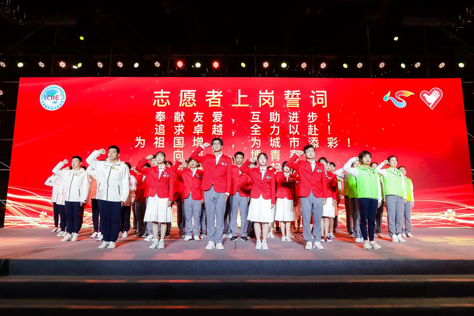 10月18日上午10时,在国家会展中心(上海)虹馆,由6位曾在疫情期间担任防疫志愿者的“小叶子”领誓,近500名第三届中国国际进口博览会志愿者与线上4300余名伙伴共同庄严宣誓“向前进,博青春!为进博,一起来!”