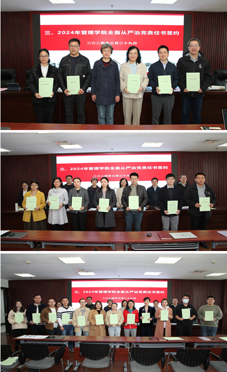 会上,学院党政班子领导、系室主任、党政办主任、党支部书记、工会主席签署了《2024年管理学院全面从严治党责任书》,层层压实全面从严治党责任,进一步夯实了学院党委全面从严治党工作根基。