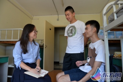 在航空运输学院的学生宿舍楼,本科生导师、飞行技术系副系主任党淑文正在与两名新生沟通交流。