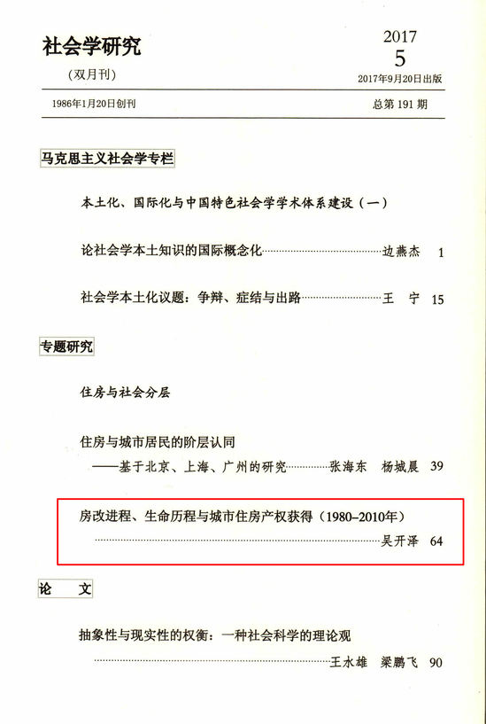 近日,文科一级学科权威期刊《社会学研究》2017年第5期刊发了管理学院青年教师吴开泽博士的论文《房改进程、生命历程与城市住房产权获得(1980-2010年)》,这是我校在《社会学研究》期刊发表的第一篇高水平论文。