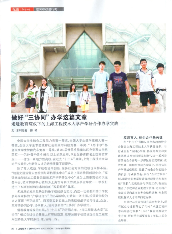 在长期的办学历程中,学校始终坚持与行业、企业“协同办学、协同育人与协同创新”,不断深化与扩大产学研战略联盟,将产学合作教育模式与卓越工程教育模式、个性化人才培养平台有效融合,在办学模式与人才培养模式上坚持传承与创新,探索出一种适合高等工程教育规律与特点的教育模式。十八大以来,“三协同”模式被写入大学章程,在学校“十三五”规划中,“三协同”模式作为工程教育的特色模式被重点提出。