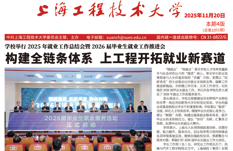 11月20日.pdf第一版学校举行2025年就业工作总结会暨2026届毕业生就业工作推进会构建全链条体系上工程开拓就业新赛道11月12日,学校在图文信息中心第二报告厅召开“强基提质拓新求变融合共赢”2025年就业工作总结会暨2026届毕业生就业工作推进会。全体校领导,相关职能部门以及各学院党政负责人,师生代表;上海市人力资源和社会保障局副局长李炜,上海市教育委员会学生处处长丁良等政府领导以及商会、企业嘉宾等出席会议。会上,校党委书记李江、校长娄永琪与政府、企业嘉宾共同启动2026届毕业生就业服务活动。学校以“强基”夯实人才培养根基、提升就业服务质效,以“拓新”开拓就业新赛道、创新工作新模式,以“融合”汇聚政校会企合力、实现多方发展共赢,为2026届毕业生就业工作注入强劲动能,进一步促进毕业生高质量充分就业。“稳就业”“保就业”事关学校人才培养质量跃升与社会评价认可的“提质”核心,事关学生职业发展前途与人生价值实现的“共赢”目标,更需以“拓新求变”的主动姿态应对就业市场新态势、破解工作推进新挑战。为明确工作任务、压实工作责任、切实做好2026届毕业生就业工作,李江向各学院负责人颁发了20