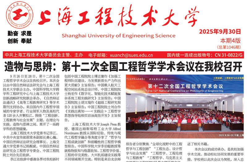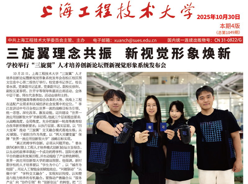 10月30日.pdf第一版三旋翼理念共振新视觉形象焕新学校举行“三旋翼”人才培养创新论坛暨新视觉形象系统发布会10月21日,上海工程技术大学“三旋翼”人才培养创新论坛暨新视觉形象系统发布会在松江校区图文信息中心第二报告厅举行。校党委书记李江,校长娄永琪,党委副书记孟星,党委副书记、副校长徐阳,副校长夏春明、许开宇等领导和嘉宾出席活动,全体中层干部、师生代表参加。活动由徐阳主持。“要把握高等教育综合改革的大势,找准上工程在适配产业需求和区域经济社会发展中的定位。”李江在讲话中号召全校以世界一流的战略目标为引领,统一思想、深化改革、激发动能,迈向建设“世界一流应用创新型大学”的新征程。他就三个层面提出要求:从战略高度、全局维度,充分把握新一轮高等教育综合改革新形势新要求;从执行层面、落实层面,以“四大变革”推动“三旋翼”交叉融合模式落地生根;从AI赋能、干部担当作为角度,以“两大关键变量”保障“世界一流应用创新型大学”战略目标实现。“真正的跨学科创新,必须从问题开始。”娄永琪作《新时期上工程人才培养模式创新》论坛主旨报告,以生动的故事串联起一个成功的跨学科、国际化教育平台的建设和发展历程,