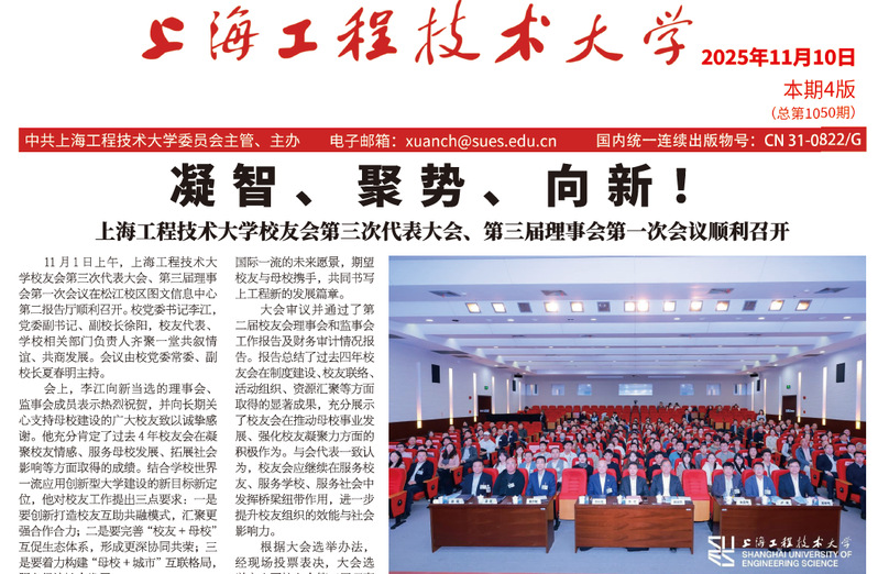 11月10日.pdf第一版凝智、聚势、向新!上海工程技术大学校友会第三次代表大会、第三届理事会第一次会议顺利召开11月1日上午,上海工程技术大学校友会第三次代表大会、第三届理事会第一次会议在松江校区图文信息中心第二报告厅顺利召开。校党委书记李江,党委副书记、副校长徐阳,校友代表、学校相关部门负责人齐聚一堂共叙情谊、共商发展。会议由校党委常委、副校长夏春明主持。会上,李江向新当选的理事会、监事会成员表示热烈祝贺,并向长期关心支持母校建设的广大校友致以诚挚感谢。他充分肯定了过去4年校友会在凝聚校友情感、服务母校发展、拓展社会影响等方面取得的成绩。结合学校世界一流应用创新型大学建设的新目标新定位,他对校友工作提出三点要求:一是要创新打造校友互助共融模式,汇聚更强合作合力;二是要完善“校友+母校”互促生态体系,形成更深协同共荣;三是要着力构建“母校+城市”互联格局,服务经济社会发展。校长娄永琪通过视频致辞,对大会的召开表示热烈祝贺,并向广大校友致以诚挚问候。他介绍了学校“工程+管理+设计”三旋翼学科交叉的发展理念,回顾了学校近期在战略合作、校区布局与国际交流等方面取得的成果。他指出,学校正沿着