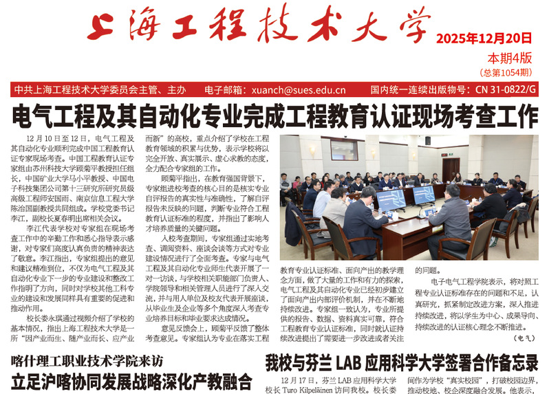 12月20日.pdf第一版电气工程及其自动化专业完成工程教育认证现场考查工作12月10日至12日,电气工程及其自动化专业顺利完成中国工程教育认证专家现场考查。中国工程教育认证专家组由苏州科技大学顾菊平教授担任组长,中国矿业大学马小平教授、中国电子科技集团公司第十三研究所研究员级高级工程师安国雨、南京信息工程大学陈治国副教授共同组成。学校党委书记李江,副校长夏春明出席相关会议。李江代表学校对专家组在现场考查工作中的辛勤工作和悉心指导表示感谢,对专家们高度认真负责的精神表达了敬意。李江指出,专家组提出的意见和建议精准到位,不仅为电气工程及其自动化专业下一步的专业建设和整改工作指明了方向,同时对学校其他工科专业的建设和发展同样具有重要的促进和推动作用。校长娄永琪通过视频介绍了学校的基本情况,指出上海工程技术大学是一所“因产业而生、随产业而长、应产业而新”的高校,重点介绍了学校在工程教育领域的积累与优势,表示学校将以完全开放、真实展示、虚心求教的态度,全力配合专家组的工作。顾菊平指出,在教育强国背景下,专家组进校考查的核心目的是核实专业自评报告的真实性与准确性,了解自评报告未反映的问题,判断专