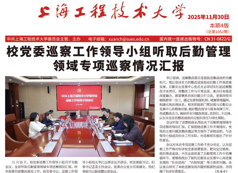11月30日.pdf第一版校党委巡察工作领导小组听取后勤管理领域专项巡察情况汇报11月25日,校党委巡察工作领导小组召开专题会议,全面听取后勤管理领域专项巡察情况汇报,研究部署后续整改落实工作。校党委书记、巡察工作领导小组组长李江出席会议并讲话,校党委副书记、纪委书记孟星主持会议。党委办公室主任高锡文,校纪委副书记段海霞出席会议。李江强调,巡察整改落实是检验巡察成效的关键标尺,要以坚决有力的整改成效推动后勤工作高质量发展。后勤实业发展中心党总支必须切实扛起巡察整改主体责任,将整改工作与日常运营、重点任务推进深度融合,既要聚焦具体问题立行立改,更要深挖问题根源举一反三,通过完善制度机制、堵塞管理漏洞,构建长效治理体系。相关职能部门需加强与后勤实业发展中心的精准对接,做好整改指导与服务保障工作,形成整改合力,确保所有问题改彻底、改到位、不反弹,以实实在在的整改成效回应组织信任与师生期盼。会议听取了巡察组组长周洁关于后勤管理领域专项巡察的情况汇报。汇报围绕巡察工作开展情况、发现的主要问题及整改建议等方面作了详细说明。与会领导小组成员结合工作实际,对巡察报告提出了针对性意见。会议对本次专项巡察