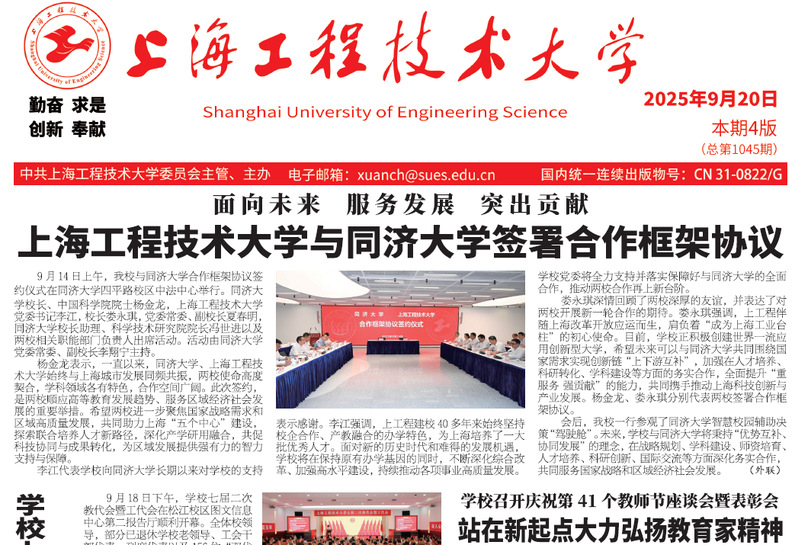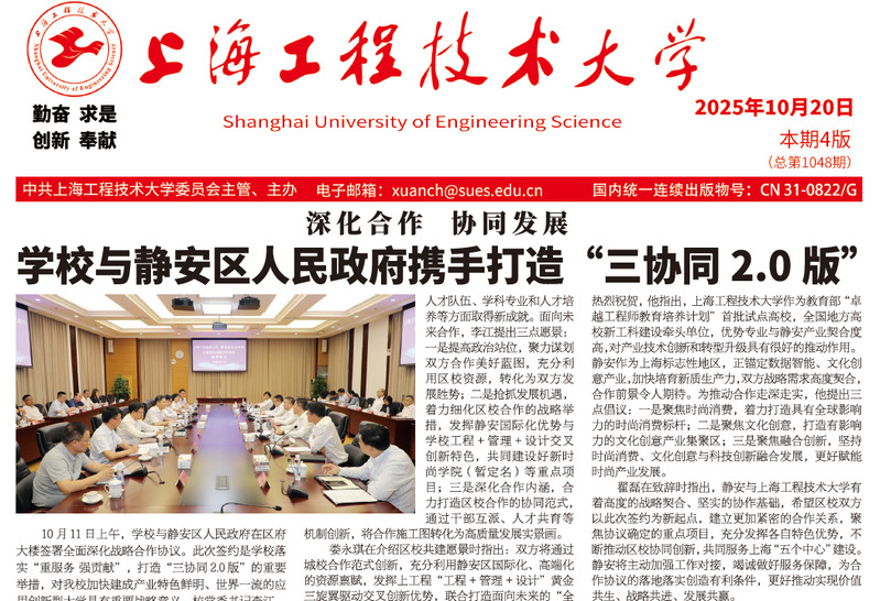 12月10日.pdf第一版学校与虹口区人民政府签署战略合作框架协议12月8日上午,学校与虹口区人民政府在虹口校区举行战略合作框架协议签约仪式。虹口区委书记李谦,区委副书记、代理区长蒋蕊,副区长陈筱洁;校党委书记李江,校长娄永琪,副校长许开宇出席签约仪式。仪式由许开宇主持。签约仪式上,李江对虹口区委、区政府长期以来对学校建设发展的大力支持表示感谢。他指出,此次签约是学校服务国家战略、深化产教融合的重要举措,并对未来的合作提出三点倡议:一是强化政治担当,齐心绘制双方合作的美好蓝图,扎扎实实落实协议签署,把施工图进一步转化成实景画;二是坚持开放合作战略,充分发挥上工程“工程+管理+设计”三旋翼驱动交叉创新优势,紧密围绕虹口区“双北联动战略”,共同建设联合实验室等创新平台,推动合作落地生根;三是丰富合作内涵,携手铸就区校合作的典型范式,围绕产业链、创新链、人才链、创业链,进一步强化科创协同、深化智库赋能、优化合作生态。李谦感谢上工程长期以来对虹口区经济社会发展的关心、支持与帮助。他指出,面向“十五五”,双方要立足服务国家和上海大局,提高政治站位,以更高政治站位前瞻谋划战略布局。要着力推动教育、