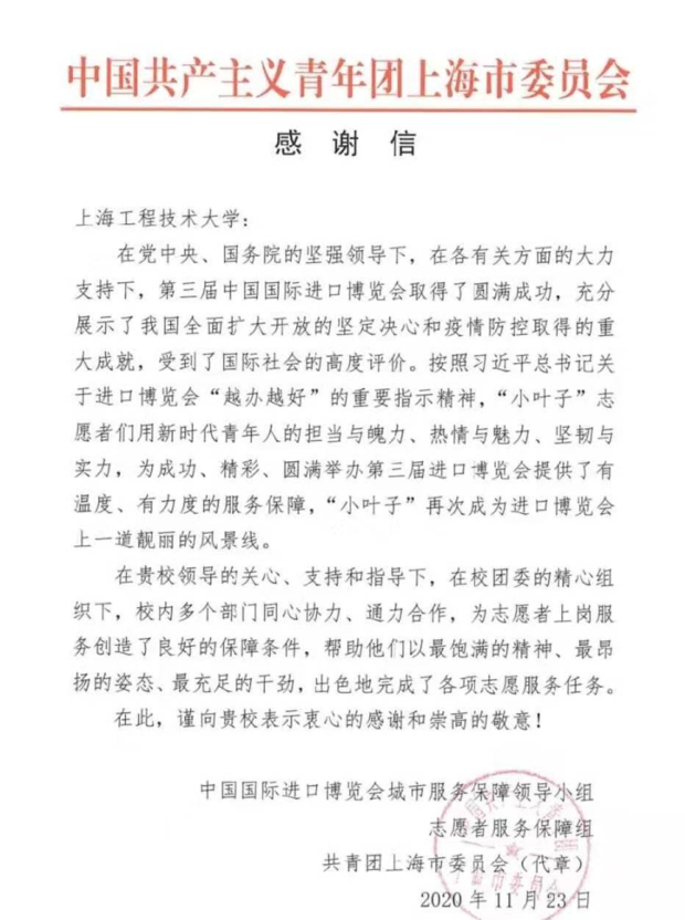 第三届中国国际进口博览会于11月10日圆满落下帷幕。近日,我校收到第三届中国国际进口博览会城市服务保障领导小组志愿者服务保障组、共青团上海市委员会发来的感谢信。