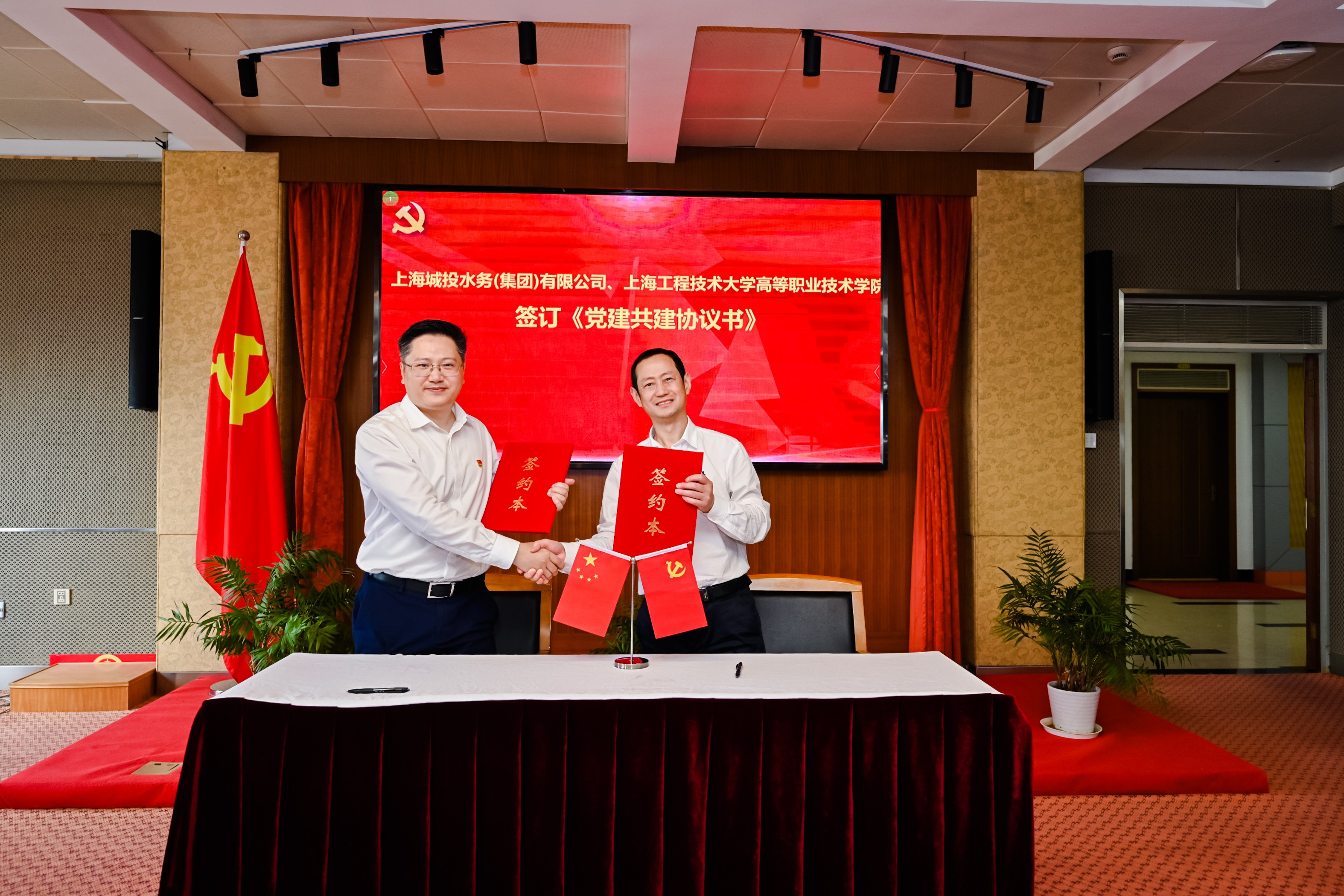 上海城投水务集团党委书记梁波和高职学院党委书记王振钧在全场热烈的掌声中,分别代表上海城投水务(集团)有限公司和上海工程技术大学高等职业技术学院郑重签署了《党建共建协议书》。