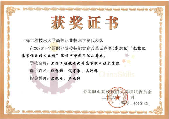 由教育部、天津市人民政府、山东省人民政府、国家发展改革委、科技部、工业和信息化部等17个部委联合主办的2020年全国职业院校技能大赛改革试点赛高职组赛项于11月28日至29日在山东济南工程职业技术学院举行, 来自全国29个省市共29支队伍参加了比赛。通过激烈的角逐,由我校高职学院机电工程系茹秋生、严伟龙、孙方、冯建明、谢真真、陈国振六位老师作为指导教师,刘林峰、吴鸿林、代宇豪3名同学组成的代表队获得了高职组“数控机床装调与技术改造”项目团体二等奖。