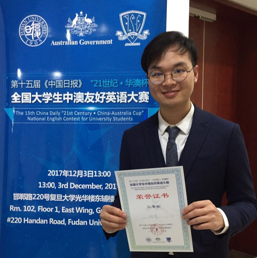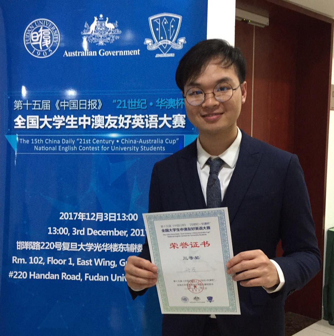 12月3日,第15届中国日报“21世纪华澳杯”全国大学生中澳友好英语大赛在复旦大学如期举行,我校外国语学院翻译专业邢彧同学荣获三等奖。