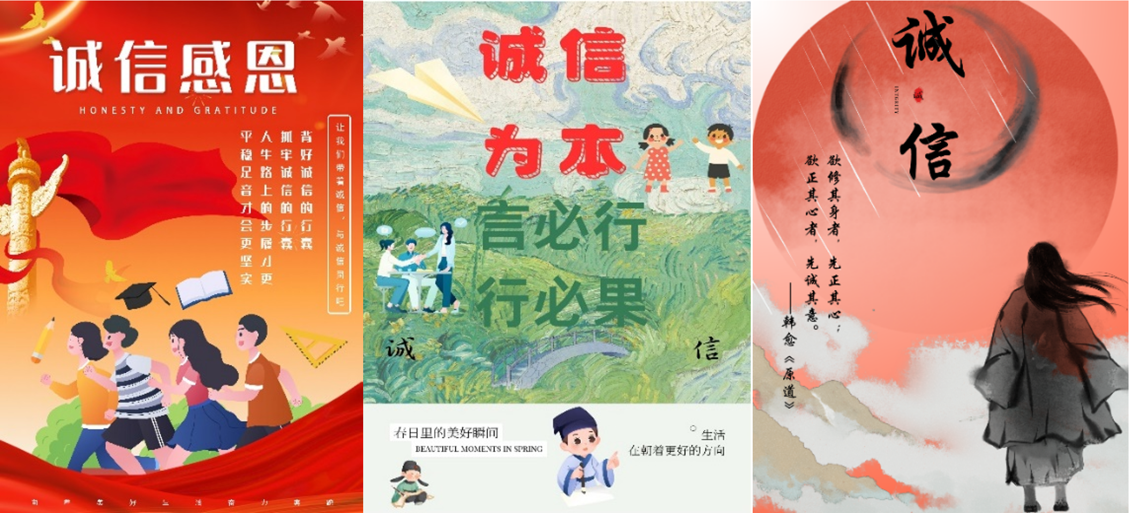 绘诚信之美,展校园风采。开展“携手诚信,心怀感恩”主题海报征集活动。以精美的视觉设计和大胆的创意展现出了对于诚信教育的理解,培养学生们的诚信意识。