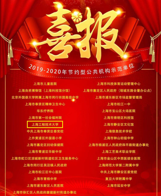 近日,国家机关事务管理局、国家发改委、财政部联合公布了《2019—2020年节约型公共机构示范单位和能效领跑者名单》,我校经过申报、创建、初评、复核、国家考核组专家现场核验等诸多环节,顺利通过各项验收评估,首次荣获“国家级节约型公共机构示范单位”殊荣,这是我校节约型公共机构建设工作取得的突破性成果。本评选年度上海市共有33家公共机构获评此国家级荣誉,我校是其中唯一一所全日制本科高校。