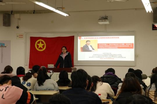 纺织服装学院党委副书记谢志霞老师讲授了我党近百年奋斗史,新中国70多年的发展史,改革开放40多年的实践史,同时鼓励同学们在学习和实践中不断向党中央靠拢,向新思想和团员要求对标,增强中国特色社会主义的制度自信,道路自信,理论自信和文化自信,激励年轻一代增强使命担当。
