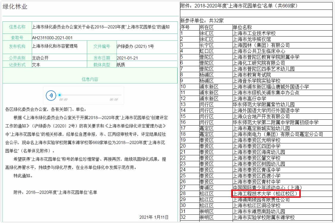 近日,从上海市绿化和市容管理局传来好消息,经过初评、复评、现场评审等环节,我校松江校区荣获“2018—2020年度上海市花园单位”荣誉称号。