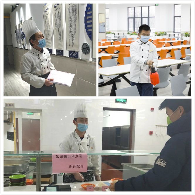 目前,雷鸣凯团队共有16名员工留了下来,负责留校师生的一日三餐,他们每天要按照疫情要求,严格进行餐后食堂前厅后厨的清洁消毒、张贴就餐告示、划分就餐区域、规范人员就餐秩序,每个细节都不能放松警惕。一遍遍对后厨、售菜间、就餐区进行消毒,对冷链食品包装进行消杀,做好每个员工一天两次的体温检测。严格执行清洗消毒程序,蔬菜、肉类、水产类有单独清洗池,生食、熟食、半成品分开存放,所有食物都留样备查。