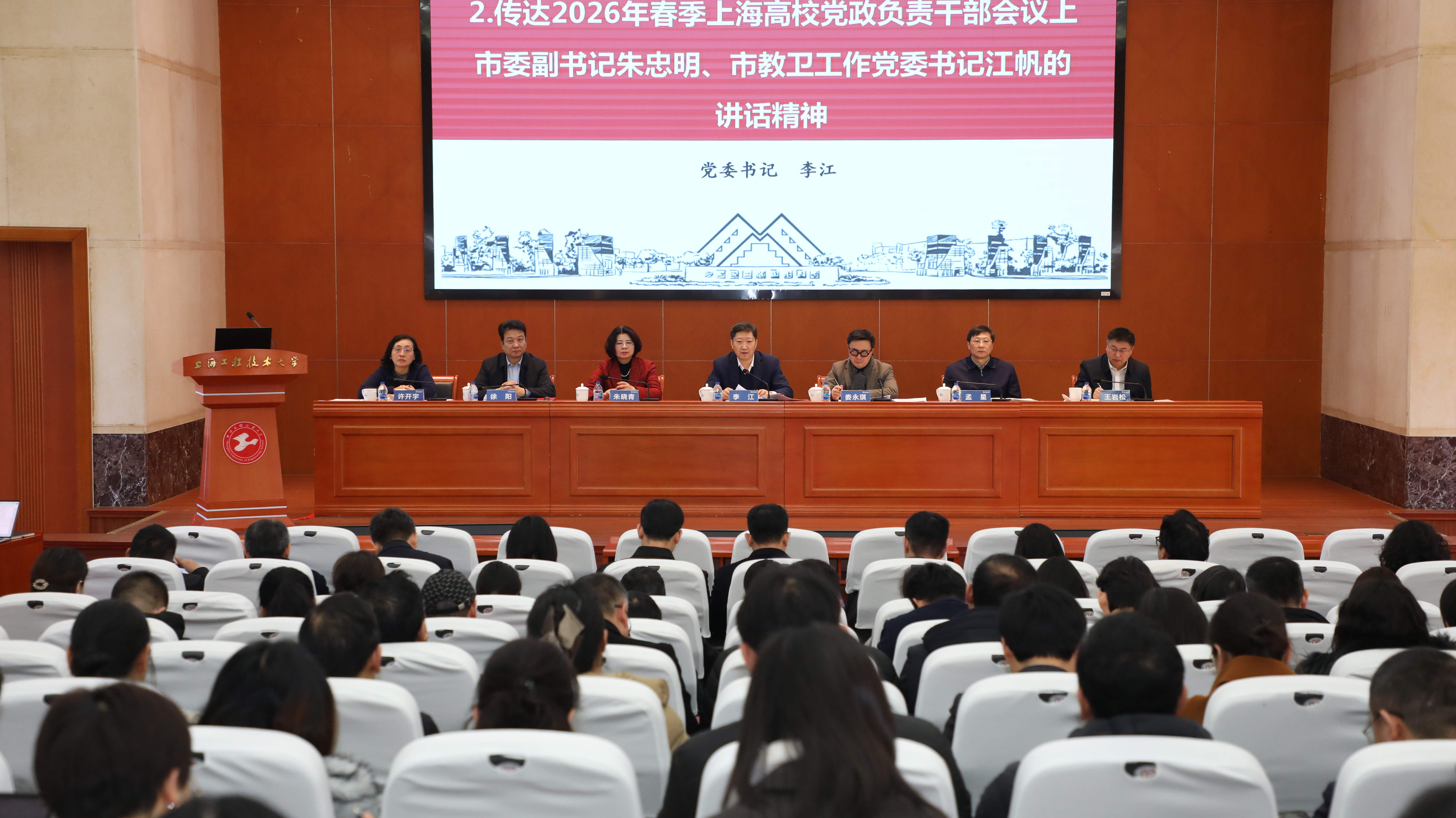 3月11日,上海工程技术大学2026年春季学期中层干部会议暨新学期务虚会在松江校区召开。校党委书记李江,校长娄永琪,党委副书记朱晓青,党委副书记、纪委书记孟星,党委副书记、副校长徐阳,副校长王岩松、许开宇,全体中层干部参加会议。会议由娄永琪主持。会上,李江传达了2026年春季上海高校党政负责干部会议上市委副书记朱忠明、市教卫工作党委书记江帆的讲话精神,并围绕学校建设产业特色鲜明、世界一流的应用创新型大学这一目标,从三个方面提出要求:一是要明晰发展形势,立足“十五五”关键期,对标国家建设全球三大中心、上海构建现代化产业体系的战略部署,把握人工智能时代的发展机遇,找准学科布局分散等短板,主动将学校发展融入国家和城市发展大局。二是要明确发展举措,把握“钱变纸”与“纸变钱”的转化逻辑,以“重服务、强贡献”为核心,深化人事、办学、资源配置改革,更新教学方案并推进学生评价、招生培养就业联动机制改革,聚焦上海现代产业整合学科资源,以大项目、大团队推进有组织科研,实现科研成果从攻关到落地的闭环,全力冲刺新一轮博士点申报。三是要强化队伍建设,抓好教师和干部两支队伍,改革教师评价体系,破除“五唯”,为青年