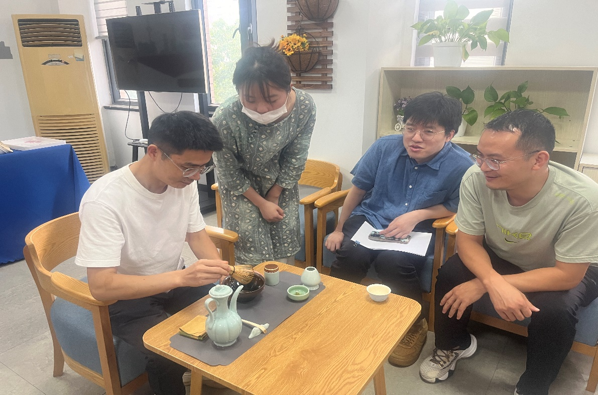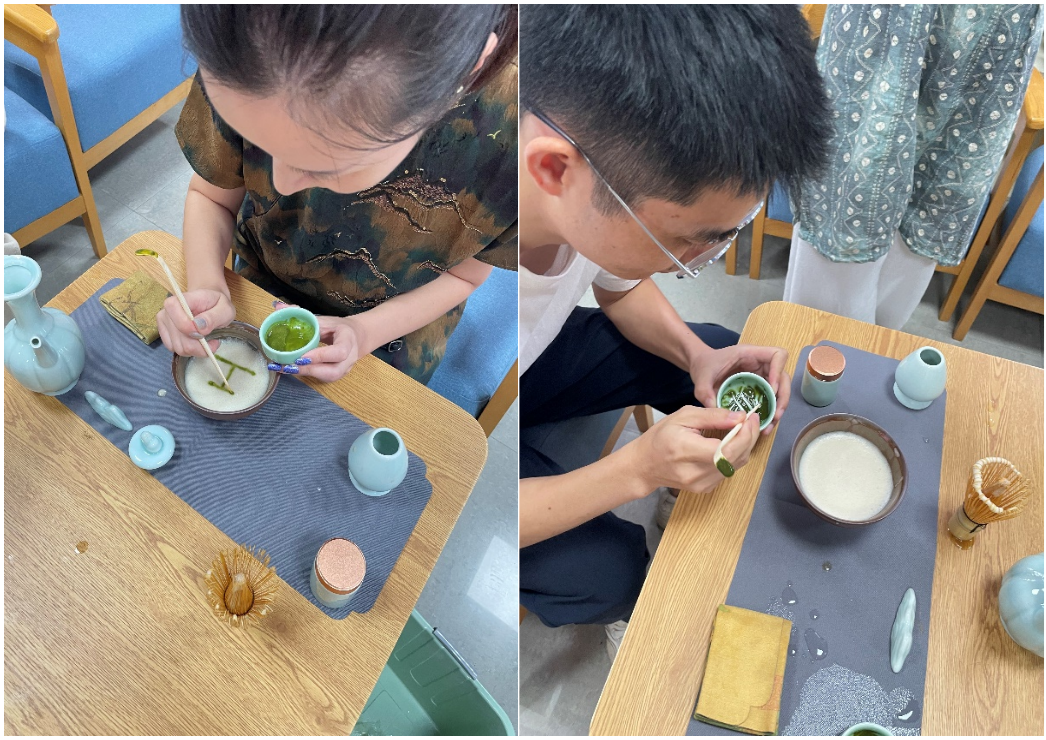 参与活动的老师在茶艺老师的指导下,手持竹筅在茶盏中来回击打,辅以茶膏进行点茶,用自己独特的方式、创意,感受点茶的独特之美。