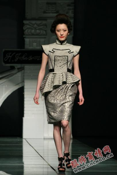 石库门元素服装系列服装:设计师将石库门门头的石雕花纹,引荐入服装的衣领、衣扣、衣摆、腰带、裙摆、配饰中,配以面料的明暗效果,展示了街前巷后的城市印记,整个系列的服装更立体,贴近生活。 |