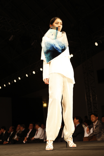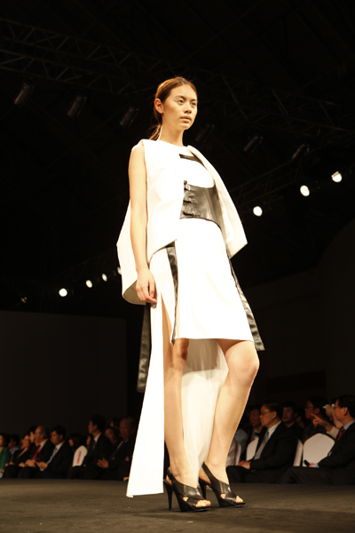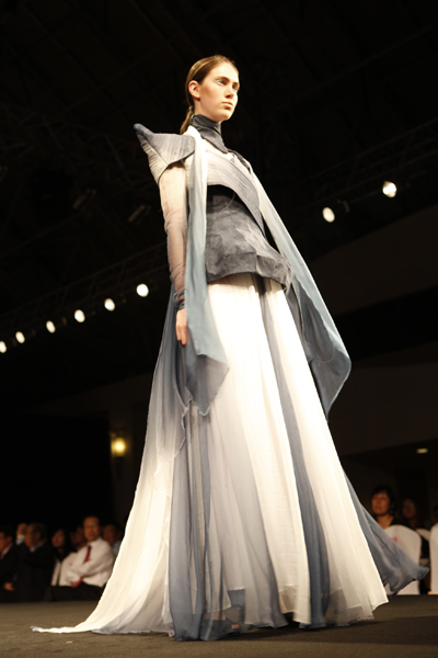 庆典仪式上,值此十周年之际,学院2012届毕业设计以“东西方相遇”为主题,用服装语言探讨东西方文化的融合、碰撞与交流。据学院相关负责人介绍,学生根据自己的理解诠释主题,表达出个人理念,设计出具有个性引领时尚潮流的服装作品。在设计过程中,学生在法方和中方教师的共同指导下,充分发挥想象力,完成从灵感来源、氛围板,到色彩研发、印花,到最终设计定稿、工艺图及市场手册的全过程。每个学生都需要自己动手制作两套服装,制作过程中的设计构思、平面裁剪、立体裁剪到最后的缝工艺纫凝聚着师生的心血和汗水。师生的心血和汗水。
