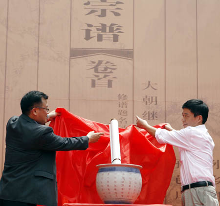 年达文化传播公司董事长、年羹尧第十二代传人年晓峰(左)在揭牌仪式上祭出镇宅之宝——大清正二年川陕总督平西大将军年羹尧平叛有功赏赐大缸。右为著名古陶瓷收藏家胡平。