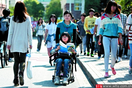 患有先天性肌营养不良症的周沁怡坐在轮椅上,继母谢春华推着她,除了给孩子整理了住宿的衣物生活用品外,谢春华也带了自己的生活用品.今年9月2日,上海工程技术大学新生报到处来了一对母女,接下来的4年,这两个人都将生活在这个校园里。 》摄影手记 10月中旬,这对特殊的母女已经在新的环境中度过了一个多月,在学生宿舍里我见到了她们。这是学校特地为她们准备的一个单间,位于一楼。谢春华正在为女儿炖骨头,她说胶原蛋白对周沁怡的病有帮助。她说,来学校之前,她预想了各种各样的困难以及该如何解决。比如,从宿舍到教学楼路途遥远;两个台阶就会成为拦路虎;有些教学楼没有电梯,轮椅无法上楼…… 另外,去年才成为继母的她在感情上要和女儿慢慢增进。“我没想到学校帮我们早就想好了办法。”谢春华告诉我,一开学老师和班长就制定了帮助她们的计划,现在每天班长会安排不同的同学去宿舍接送周沁怡。要是碰到没有电梯的教学楼,就让力气大的男生背她上楼。在食堂同学们也会帮她排队买饭。周沁怡是一个特别要强的女孩,她经常做一些适度的锻炼并坚信自己会慢慢好起来,她也希望自己今后可以不再麻烦妈妈和同学。 “人们常说,在家靠父母出门靠朋友,但对于周沁怡来说,出门之后不仅要靠朋友还要继续靠父母、靠学校、靠同学。”学校的老师告诉我,“人生总会有一些坎坷,我们在这个阶段相遇了,我们就做一些力所能及的事情来帮助她,新的生活总是在不停适应和调整中度过的,对于周沁怡和其他的同学来说,这样的大学生活将成为他们的一堂人生必修课,每一个人都会从中有所收获。我也相信周沁怡总有一天可以依靠自己的力量生活。” |