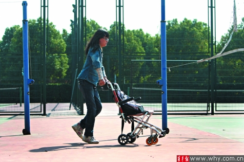 上体育课的时候,周沁怡就一个人扶着轮椅进行康复训练。