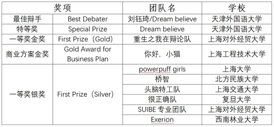 8支总决赛代表队巅峰对决,在比赛中,唇枪舌剑,各执己见,用英语就实际商业案例进行论辩,展现了选手们在跨文化交流、商业思维和公共演讲方面的综合实力,彰显了00后青年的敏锐观察力和蓬勃朝气。比赛最终产生最佳辩手1名,特等奖1名,一等奖金奖1名,一等奖银奖6名和商业方案金奖1名。我校参赛队“你好,小猫”获得商业方案金奖。
