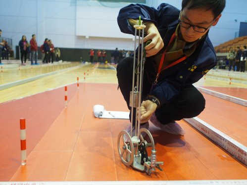 尽管原理相同,但“无碳小车”形状各异,车上几十个零部件均由学生个性设计、手工加工,需要兼顾快慢、远近、轻重等指标,取得最佳的能量转化率。在直线障碍赛道上,10根障碍杆的间距经抽签确定,可调范围从70到