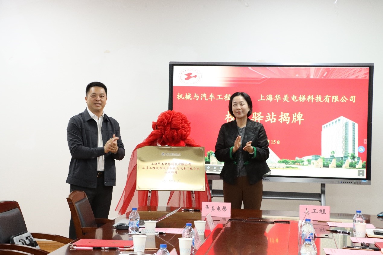 在校企双方见证下,张立强与华美电梯副总经理汤俊签订了共建产学合作基地协议书,虞蓉和金立矿为上海华美电梯科技有限公司校友驿站揭牌。校友驿站的建立为校友与母校搭建了沟通交流的平台,也为后续进一步开展校企合作、科技成果转化、产教融合奠定了基础。
