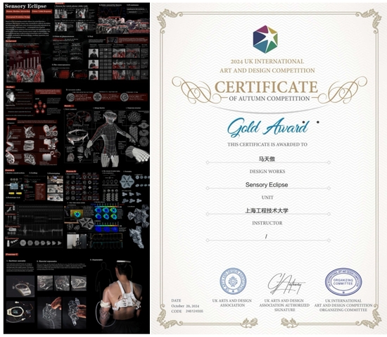 作品《Sensory Eclipse》以未来低感知社会为背景,设计了一套结合arduino、应力测试及有规分形技术的可穿戴设备。本年度,马天傲共斩获5项国际奖项,包括2024英国国际艺术设计大赛银奖两项、英国Gcross国际创意奖铜奖和芬兰AG国际设计奖铜奖,并荣获国家奖学金,这些成就均源于他的深厚积累与不懈努力。