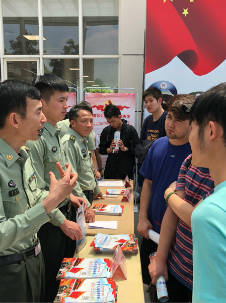 图说:长宁区人武部的干部正在回答大学生们关于征兵政策等方面的咨询。市政府征兵办供图