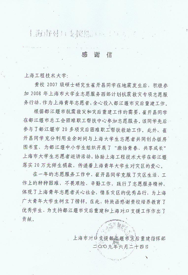 按照当地安排,崔开昌结合自己所学的社会保障专业,加入都江堰市总工会困难职工帮扶中心,先后参与了全市因灾职工房屋严重损坏情况调查、地震后新增受灾困难职工调查统计建档、受灾孤儿单亲儿童调查、受灾困难职工子女“金秋助学”、受灾家庭妇女绒绣技能培训、因灾建档困难职工免费就业培训、都江堰市“奔向新希望”板房运动会等帮扶救助活动,任劳任怨,尽心尽力。