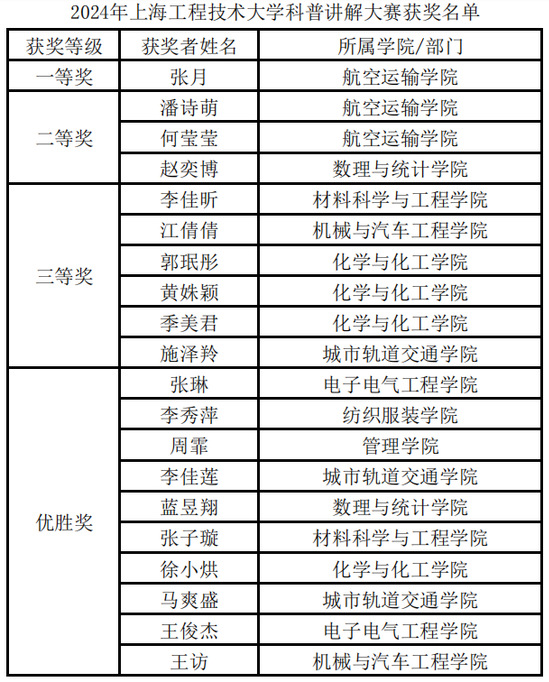 12月6日,2024年上海工程技术大学科普讲解大赛落下帷幕。本次大赛以“科技创新,科学普及”为主题,经过初赛选拔,20名选手脱颖而出晋级决赛。经过紧张激烈的竞争,航空运输学院张月荣获一等奖,航空运输学院潘诗萌、何莹莹和数理与统计学院赵奕博荣获二等奖,材料科学与工程学院李佳昕等6名选手荣获三等奖。