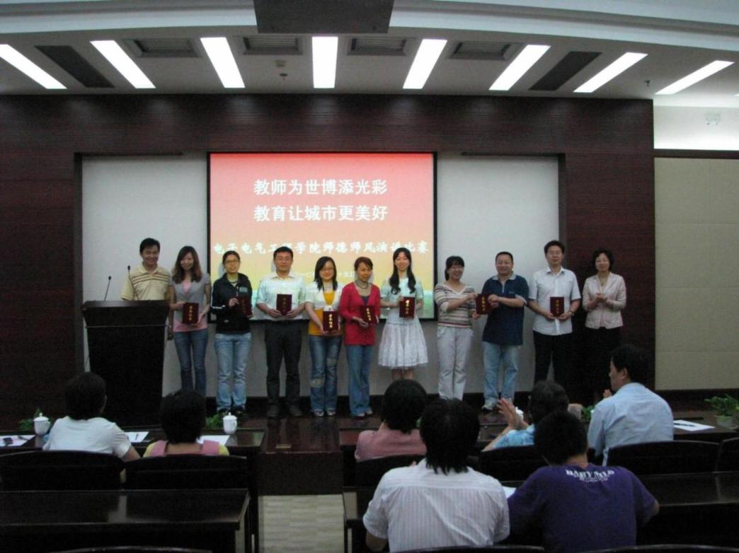 比赛中,教师代表们运用各种演讲技巧,或抑扬顿挫,或慷慨激昂,自然的真情流露感染了在场的师生,他们的演讲勾画了教师们忙碌的身影,凸显了教师在世博舞台上的突出成绩,体现了教师身上肩负着教育使命的重任,以及为学生营造良好的学习环境、培养创新型技术类人才、激发学生的创造力所作出的努力。 经过评委们的认真打分,本次师德演讲比赛中学院学生工作办公室梅元媛获得一等奖;自动化系王宇嘉、陈小龙、计算机中心张晓梅、计算机系黄润才获得二等奖;中心实验室朱文立、电气工程及其自动化张菁、电子信息工程系王永琦以及代表电子基础教研室的陈万辉获得三等奖。 最后,学院党总支书记茅蕾讲话,她希望教师们对自己的岗位继续保持高度的责任意识,牢记“教育为本,以德为先”,弘扬优秀教师的先进事迹,全面推进师德师风建设,做到爱岗敬业,为人师表,做教书育人的楷模;锐意进取,追求卓越,作自主创新的先锋;求真务实,严谨治学,做高尚学术道德的榜样;希望大家发扬团队精神,为学院内涵建设和科学发展贡献自己的力量,为学院的教育事业再建新功。 | |