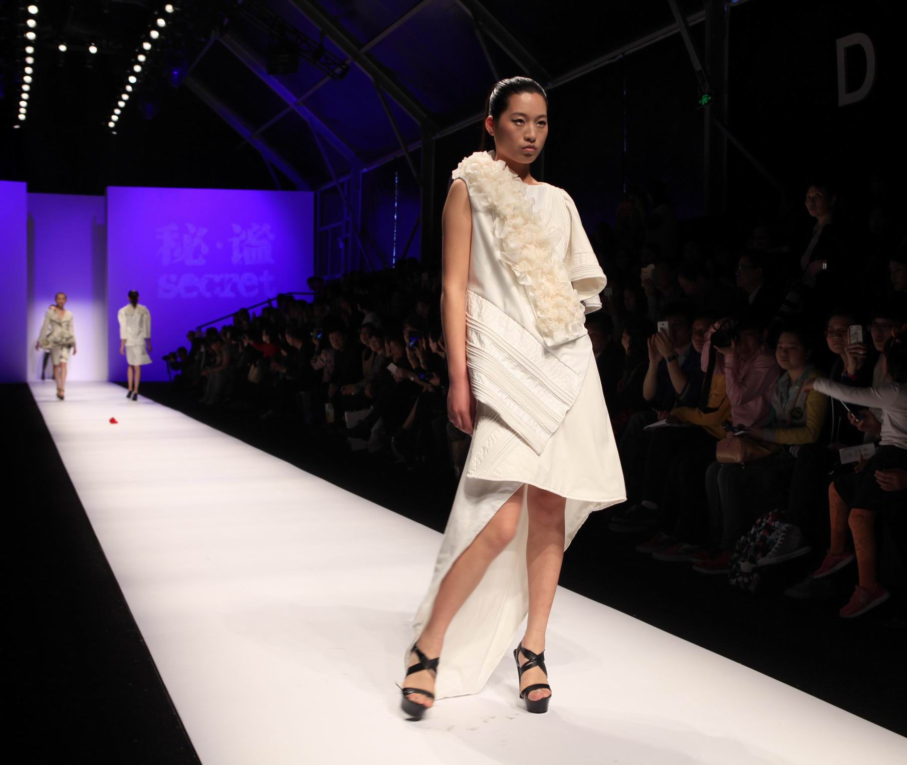 本届毕业设计作品均在教师的精心指导下由学生亲自动手剪裁制作完成,体现出学生们充满张力的创意与极高的完成度。在《秘谧》系列作品的创作中,我们可以看到新生代设计师们立足自身潜力的挖掘,试图用创意思维和时尚语言去理解和诠释对神秘未知世界的探寻。精彩的作品吸引了媒体的关注,发布会结束后,多位学生作为设计师接受了上海电视台、服饰月刊、青年报等多家媒体采访。T台不仅仅只是对一件件设计作品的展现,更是孕育着无限可能的未来。