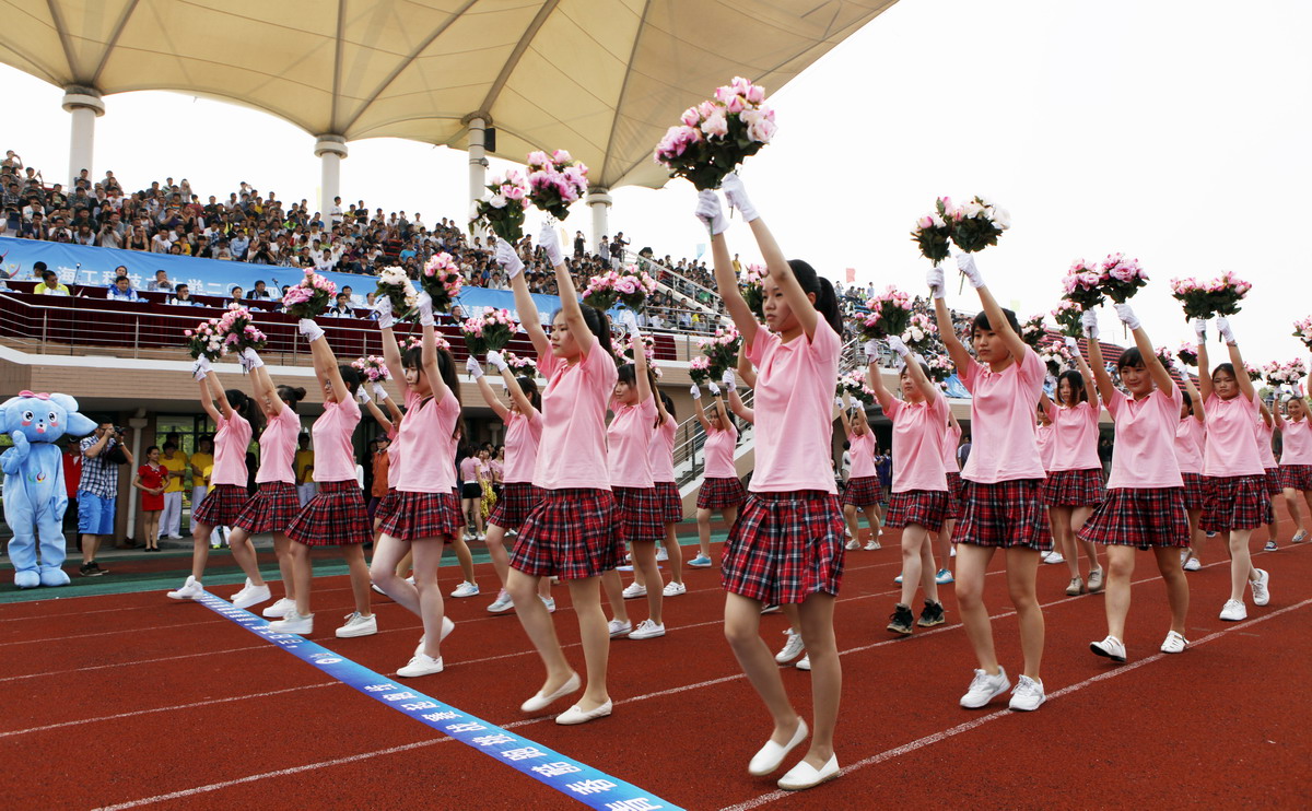 最后一个上场的节目是大型有氧舞蹈团体表演——青春吐艳。在《喜羊羊与灰太狼》耳熟能详的音乐中,500名女生穿着鲜艳活力奋发的出现在了绿茵场上。啦啦球翻滚,跳跃、一起、一伏都让学生们欢呼雀跃,运动会的气氛在这一刻被激扬的旋律与学生们热烈的新气象中推向了高潮。