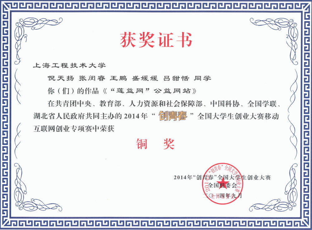 在刚落下帷幕的2014年“创青春”全国大学生创业大赛中,我校材料工程学院张涛团队《特创防护用品有限责任公司》参赛项目经校内赛、上海赛、全国赛的重重选拔和比拼,荣获“创青春”全国大学生创业大赛第九届“挑战杯”创业计划竞赛全国铜奖的荣誉,我校管理学院倪天扬团队的《“莲益网”公益网站》参赛项目获2014年“创青春”全国大学生创业大赛移动互联网创业专项赛铜奖。