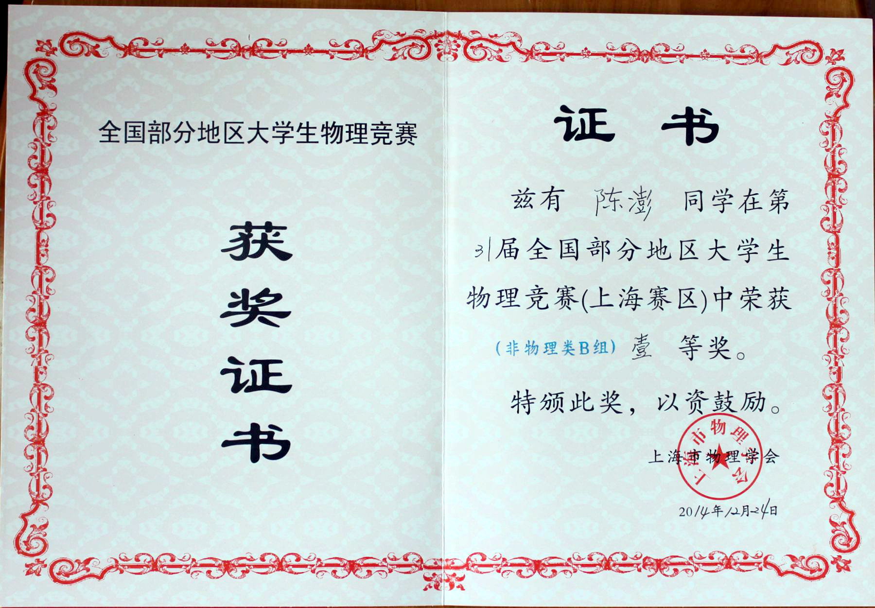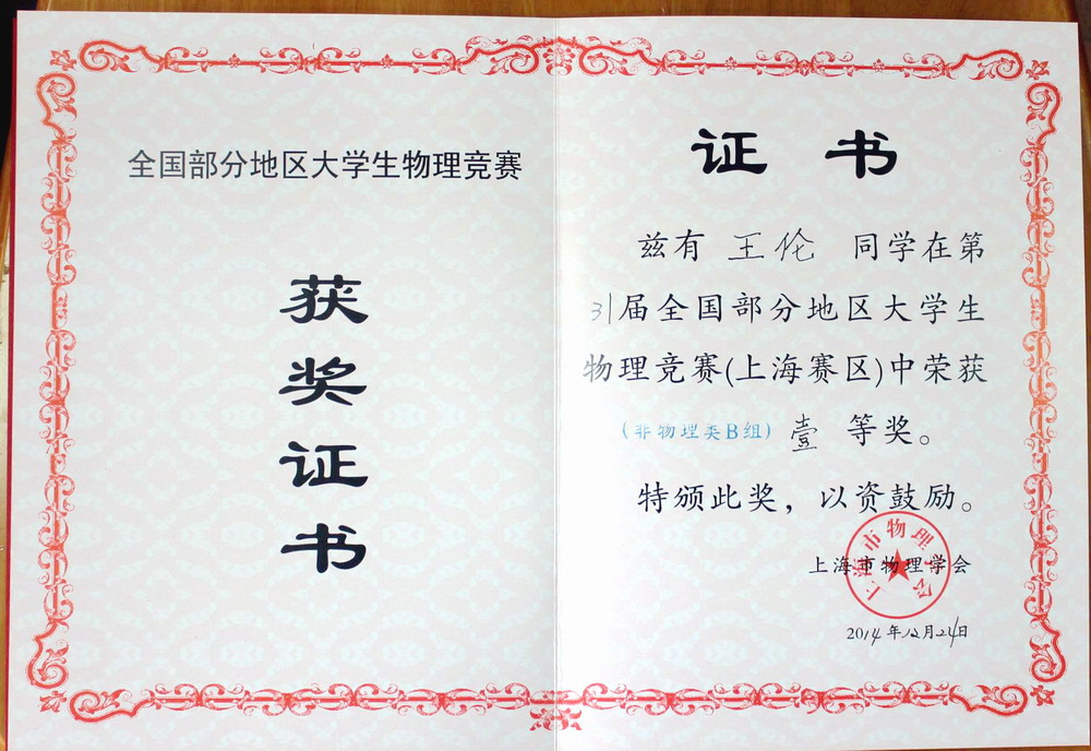 第31届全国部分地区(上海赛区)大学生物理竞赛于近日圆满落下帷幕,组办方处传来佳音:我校学子在去年良好成绩的基础之上,再创佳绩,共有24名同学获奖,其中3名同学荣获一等奖,7名同学荣获二等奖,14名同学荣获三等奖。