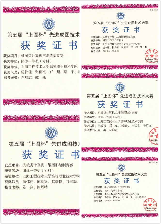 近日,从上海市第五届“上图杯”先进成图技术大赛颁奖大会传来喜讯,高职学院代表队斩获佳绩。其中二维绘图项目夺得团体一等奖1项,团体二等奖2项;三维造型项目夺得团体中一等奖1项,团体二等奖1项;二维绘图项目个人一等奖4人;三维造型项目个人一等奖3人,二等奖1人。陈丹晔、余启志、陈燕和朱英翔四位老师获得优秀指导教师奖。此次大赛中二分之一以上的专科组奖项被高职学院学生收入囊中,创造了学院有史以来参赛的最好成绩,在上海市的高职院校中独占鳌头,为学校和学院争得了荣誉。
