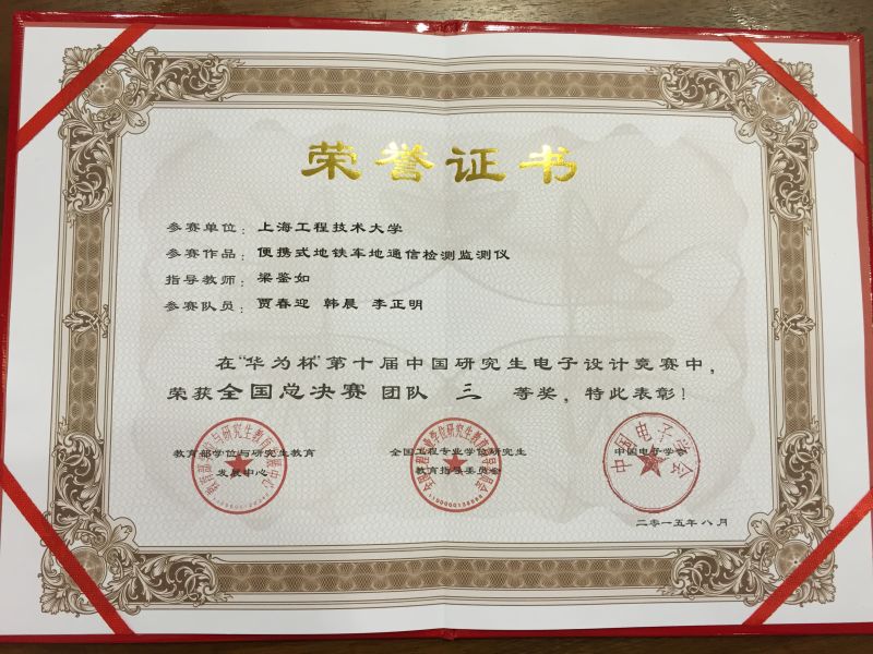 电子电气工程学院 | 工程大电气一队 | 便携式地铁车地通信检测监测仪 | 贾春迎 李正明 韩晨 | 梁鉴如 | 全国三等奖/华东赛区一等奖 |
