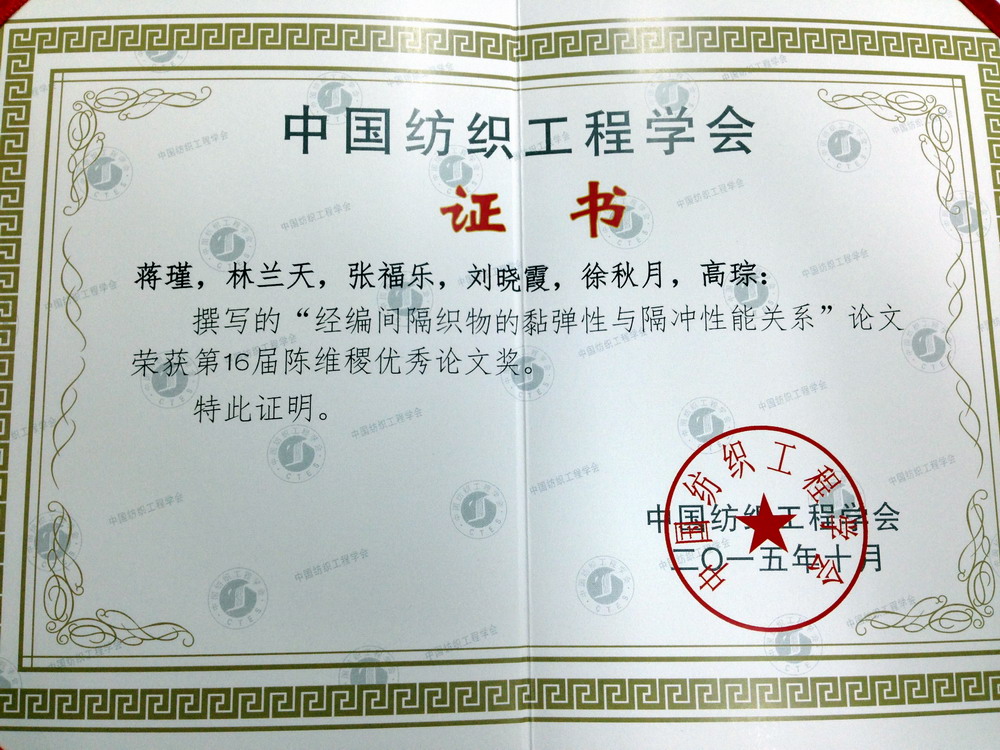 10月15日,从2015 中国纺织学术年会上传来喜讯,我校服装学院研究生蒋瑾所撰写的论文《经编间隔织物黏弹性与隔冲性能关系研究》荣获第16届陈维稷优秀论文奖。
