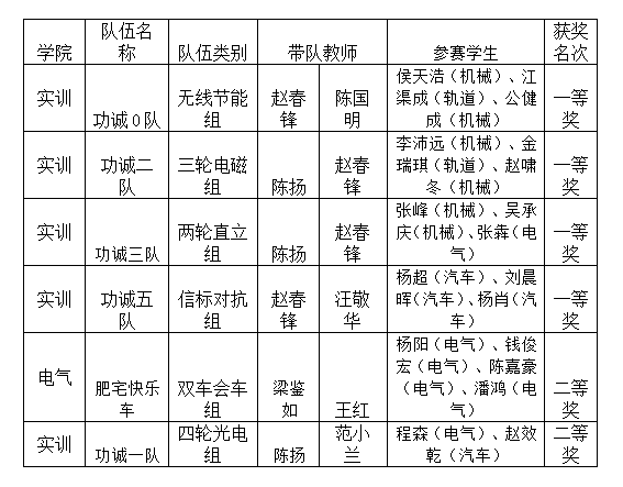 经过不懈努力,由工程实训中心指导的队伍获得华东赛区无线节能组一等奖、三轮电磁组一等奖、两轮直立组一等奖(亚军)、信标对抗组一等奖、四轮光电组二等奖,电子电气工程学院指导的队伍获双车组二等奖。