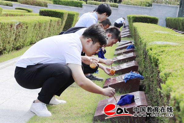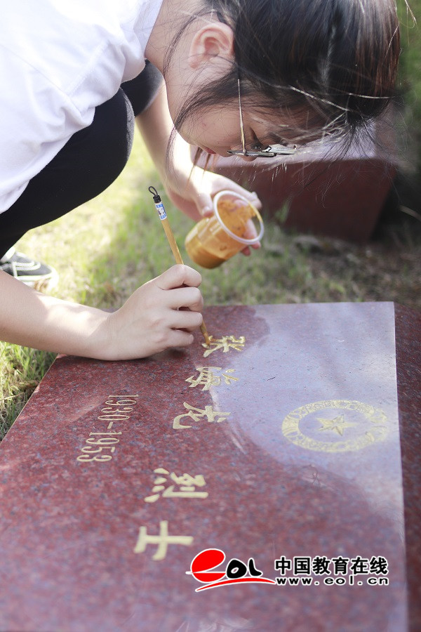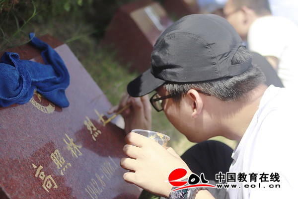 随后,青年同学们拿起毛笔、蘸上金粉,为陵园内173位烈士墓碑进行描金临摹。每一笔一划,同学们都小心翼翼、耐心细致,防止笔墨描出边外。同学们表示此次活动让自己在先烈的丰功伟绩中学到了热爱祖国、坚定理想的情感品质和高尚精神,同时也锻炼了吃苦耐劳、甘于奉献的人生态度,对自己未来的学习和生活都有着重要的帮助。来自化学化工学院的大一学生刘书嘉有感而发:“三个小时临摹墓碑活动,虽然一直保持着一个姿势,手会很酸痛,但我们每个同学都一笔一划很用心的在描画,生怕描到字体以外或是粗细不均。烈士们为了国家献出了自己的生命,我想我们用这样的方式和认真的态度向他们致敬,今后也要用这样的态度去认真学习工作,就是对他们最好的纪念和缅怀。”