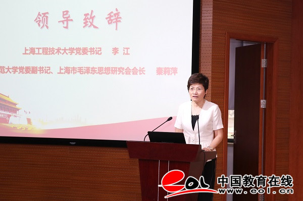 上海师范大学党委副书记、上海市毛泽东思想研究会会长秦莉萍也在会上致辞。她指出,在新时代,要深入学习领会习近平新时代中国特色社会主义思想和党的十九大精神,研究总结改革开放四十周年以来的伟大实践和成功经验,重点聚焦习近平总书记关于教育改革发展的系列重要论述,为着力推进马克思主义中国化时代化大众化,为推进落实党的十九大确定的各项目标任务积极出谋划策,贡献上海学者的力量。希望与会专家学者能在热烈的学术对话与交流中,在思想冲撞与交融中,品位当代理论创新的精髓和魅力。最后,她预祝本次论坛取得圆满成功。