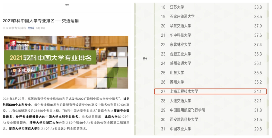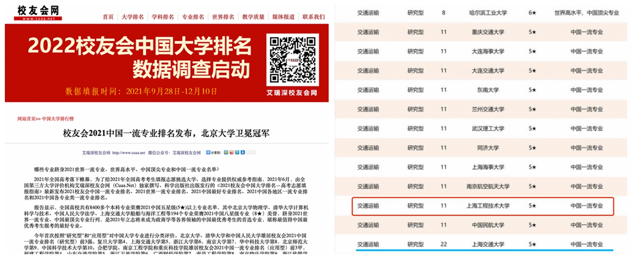 最近,我校交通运输专业在国内各类大学排行榜中成绩靓丽:高等教育评价专业机构软科发布的2021 “软科中国大学专业排名”中,交通运输专业排名第27名,排名全国前20%;第三方大学评价机构艾瑞深发布的2021校友会专业排名中,交通运输专业更是突破性被评为5星,划入“中国一流专业”梯队。