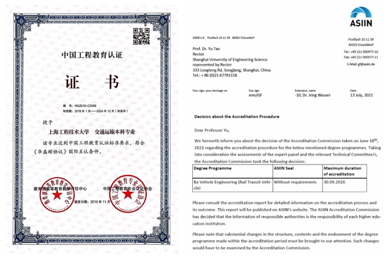 学院鼓励和组织各个专业积极参与教育部工程教育认证及工程专业国际的认证,根据专业认证标准改进课程体系,改造相关教学环节和设施。将认证工作的“成果导向教育”理念作为专业建设、人才培养等各项工作中的突破口,推动专业建设和整体教学水平再上新台阶。学院交通运输专业于2019年1月顺利通过教育部工程教育认证;车辆工程(城市轨道交通车辆)专业于2021年7月一次性“无条件”通过ASIIN认证,有效期为6年,也是我校首个开展并通过国际专业认证的专业。轨道交通信号与控制、铁道工程专业也已启动国际ASIIN认证。
