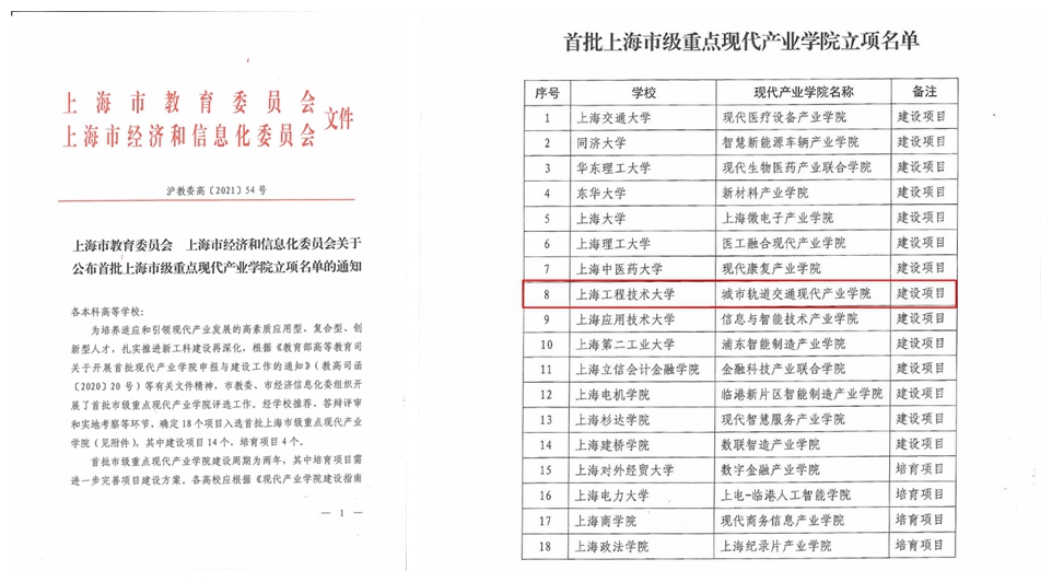 功夫不负有心人,凭借专业优势,鲜明的行业特色,与产业紧密的联系,日前,上海市教委、市经信委联合公布的首批上海市级重点现代产业学院立项名单中,城市轨道交通现代产业学院建设项目成为首批入选的建设项目之一,并作为8所高校之一正在申报、冲刺国家级现代产业学院。